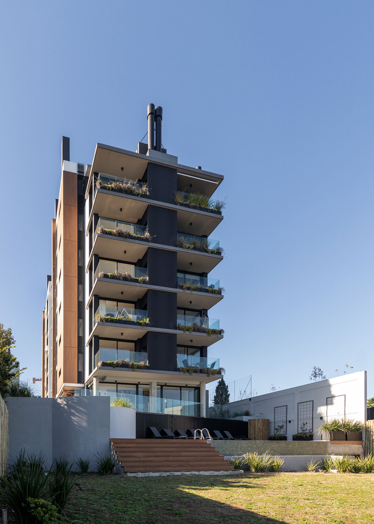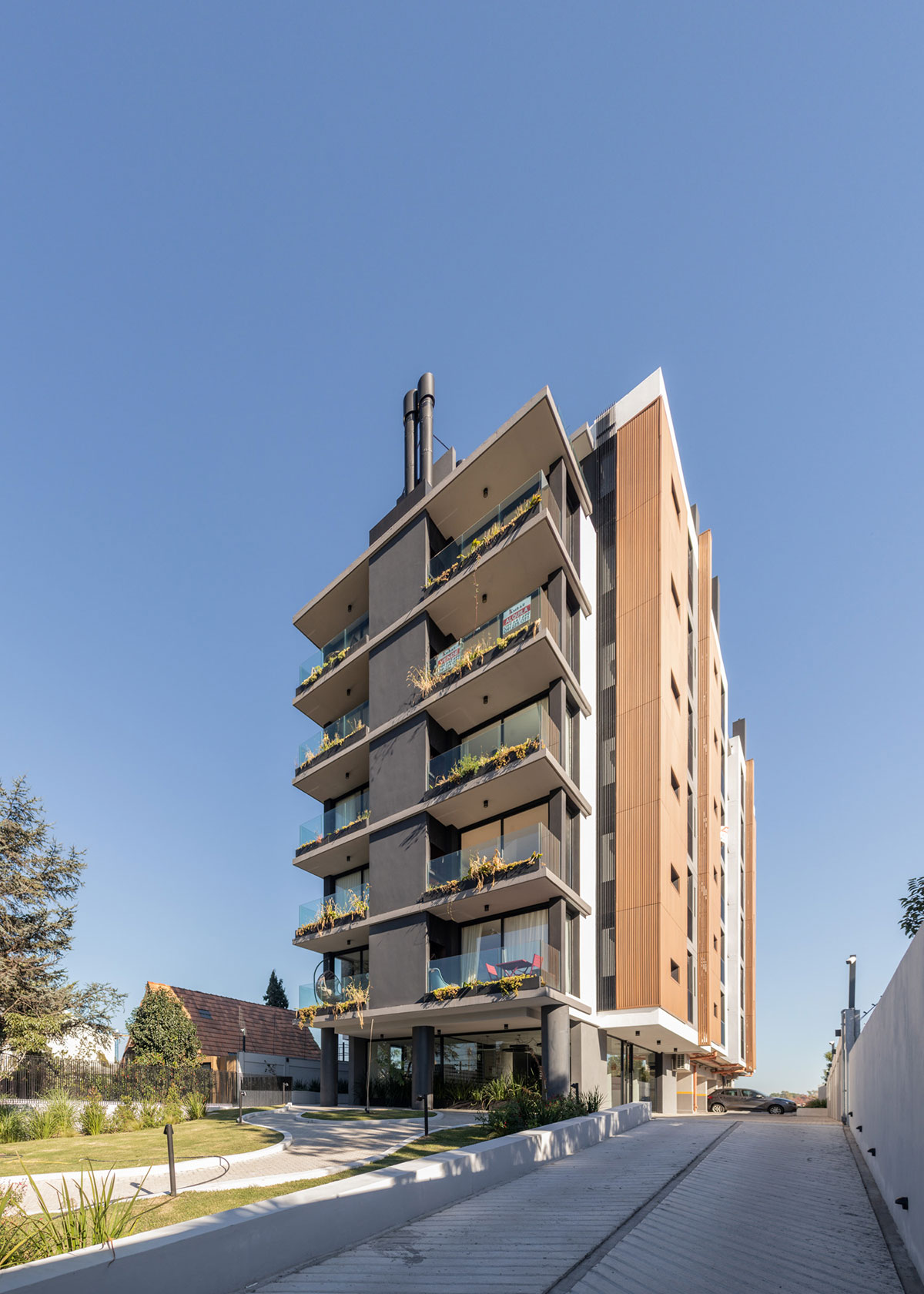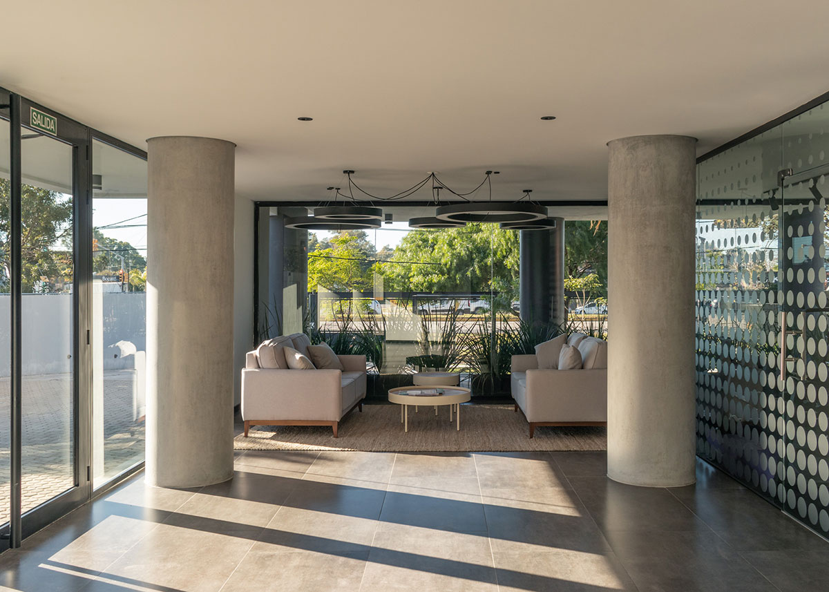 En dicha torre se proyectan 36 apartamentos desarrollados en altura, que contienen unidades de 1 y 2 dormitorios. En Planta Baja se ubican 12 cocheras y en el Nivel -1 a 1.60m por debajo del nivel 0.00 de la vereda, se ubican 24 estacionamientos, sin estar enterrados. El edificio no cuenta con Subsuelo.