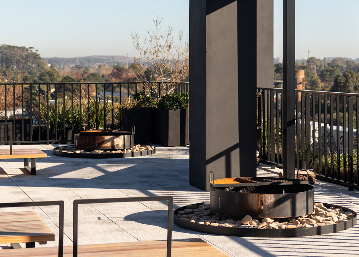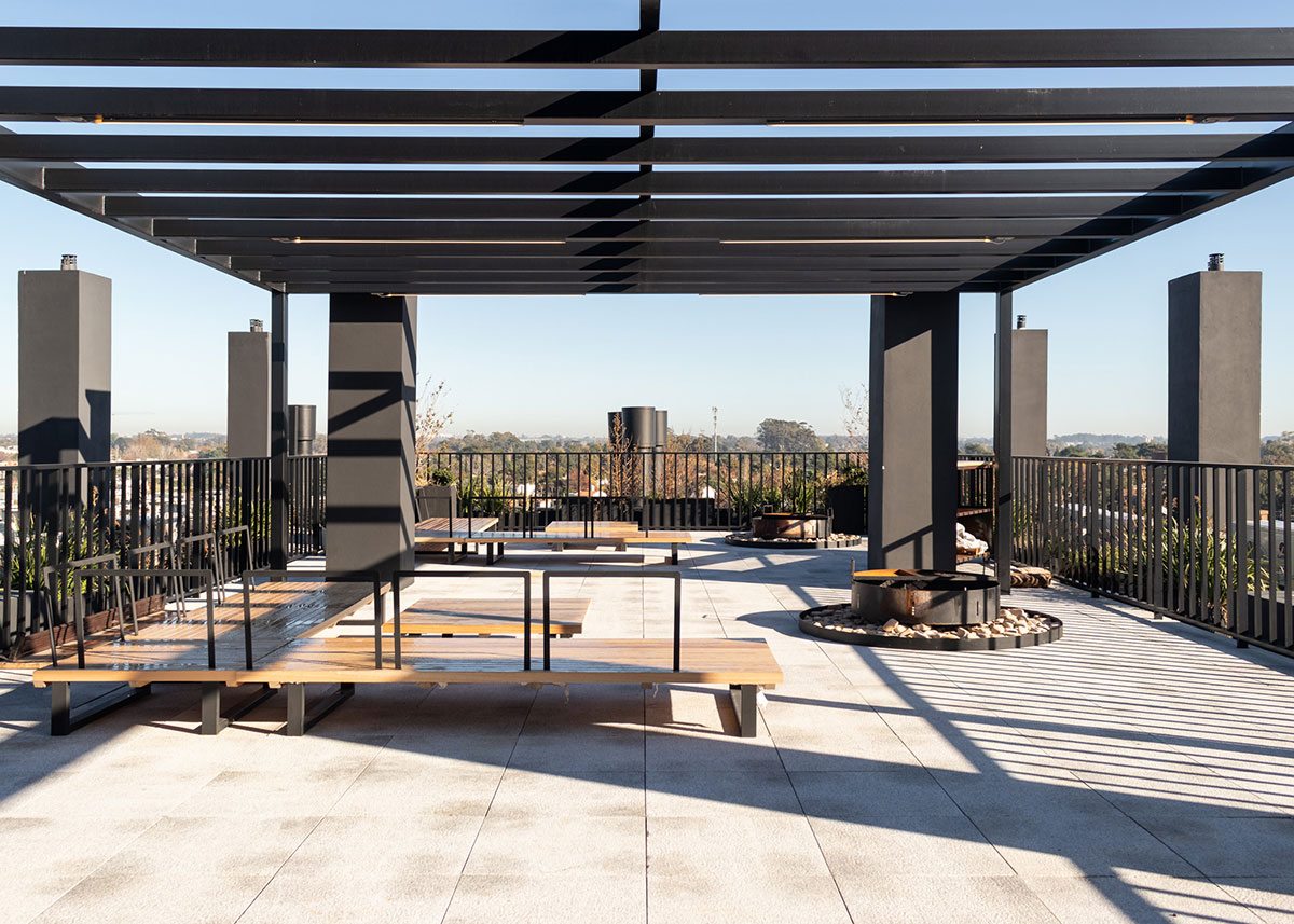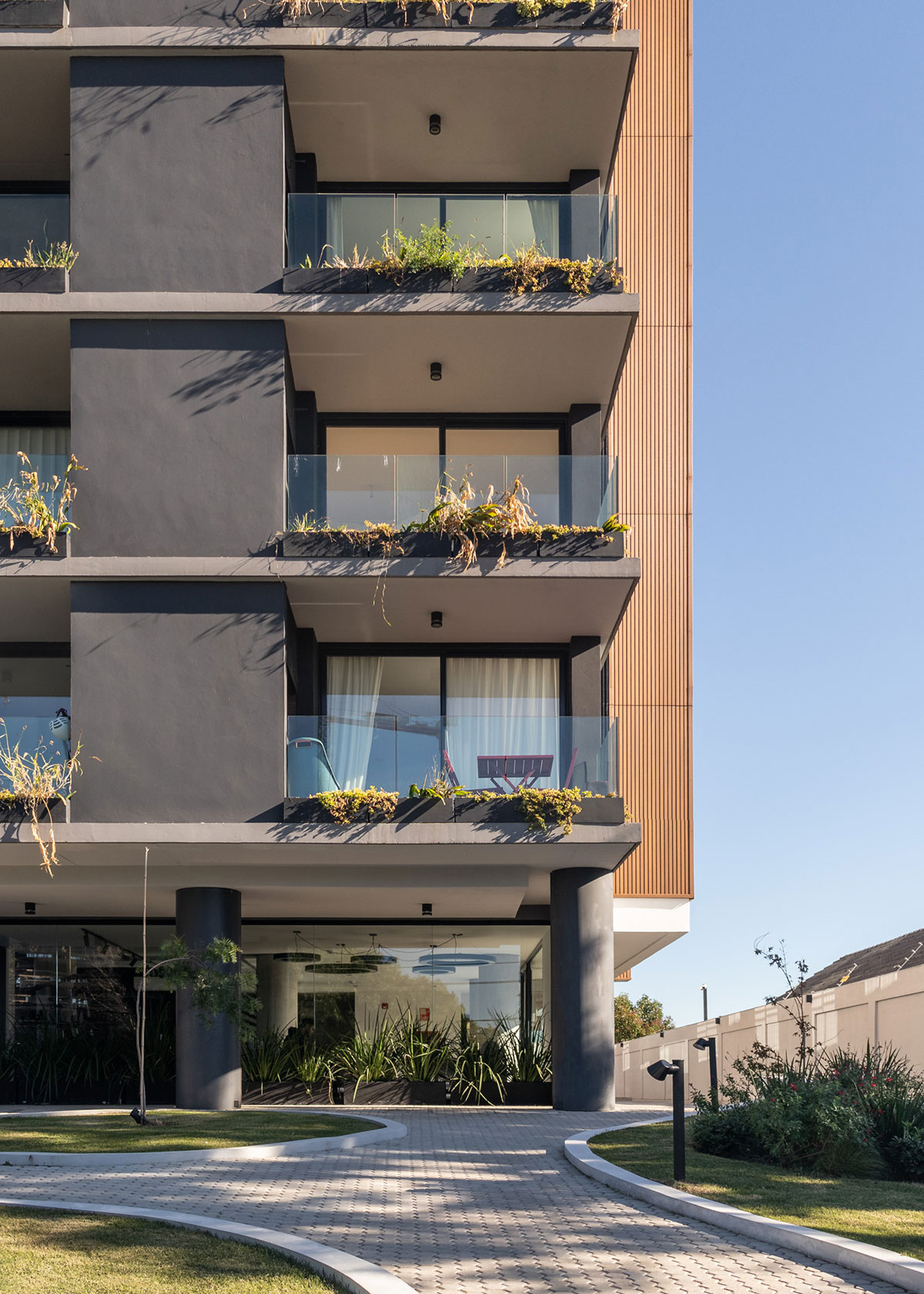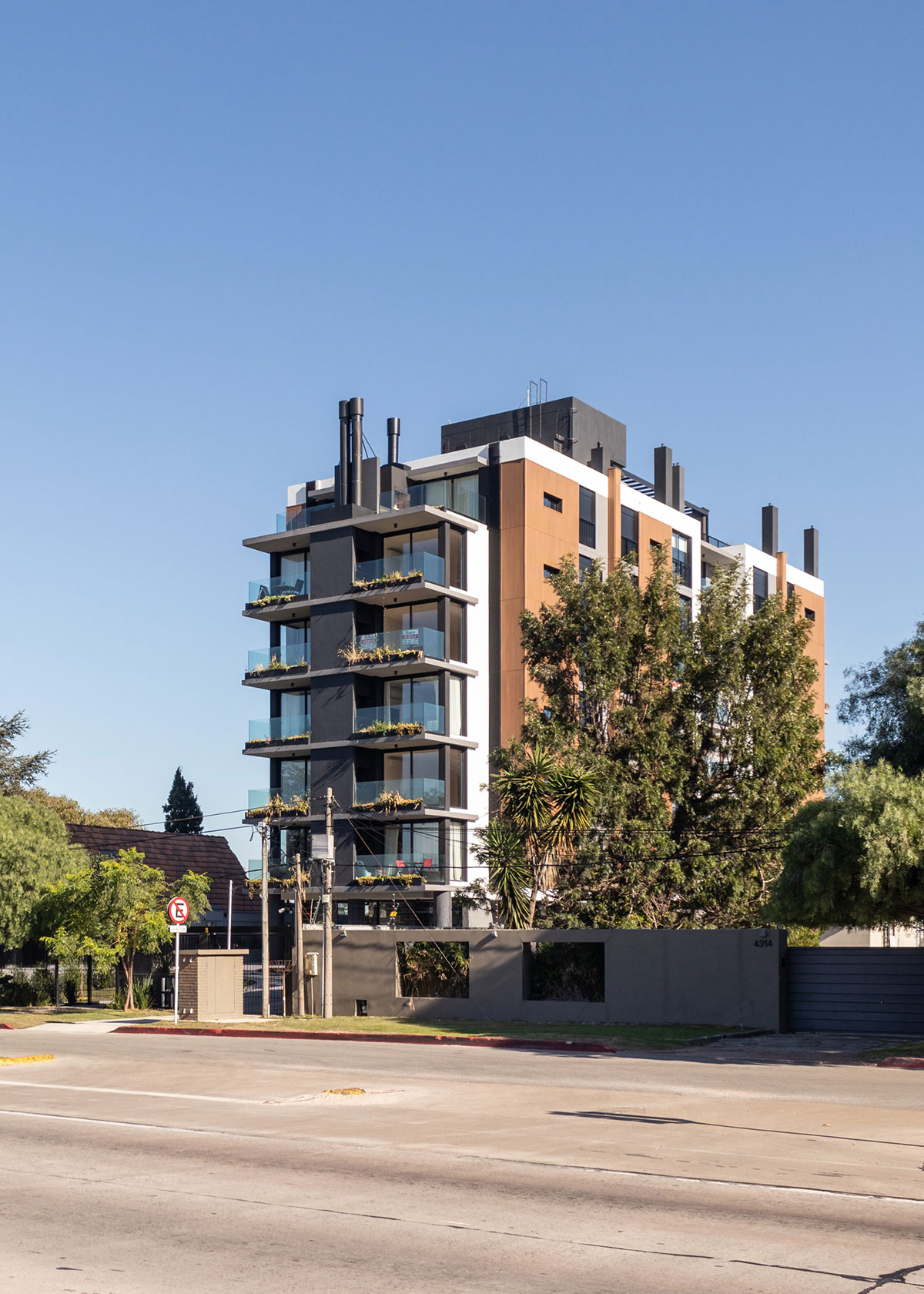 En dicha torre se proyectan 36 apartamentos desarrollados en altura, que contienen unidades de 1 y 2 dormitorios. En Planta Baja se ubican 12 cocheras y en el Nivel -1 a 1.60m por debajo del nivel 0.00 de la vereda, se ubican 24 estacionamientos, sin estar enterrados. El edificio no cuenta con Subsuelo.